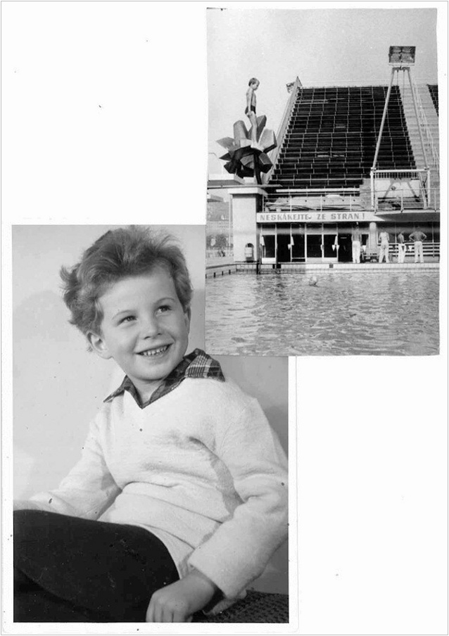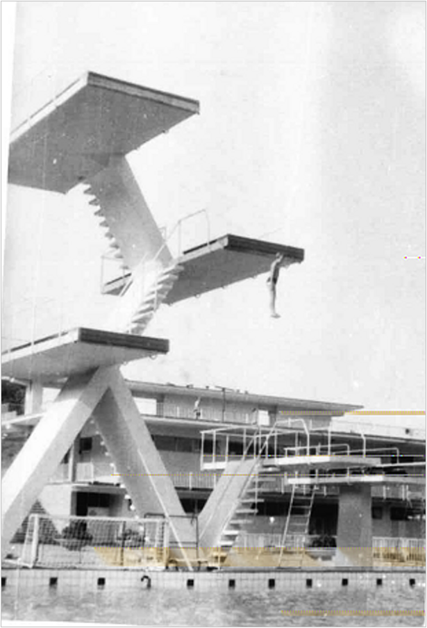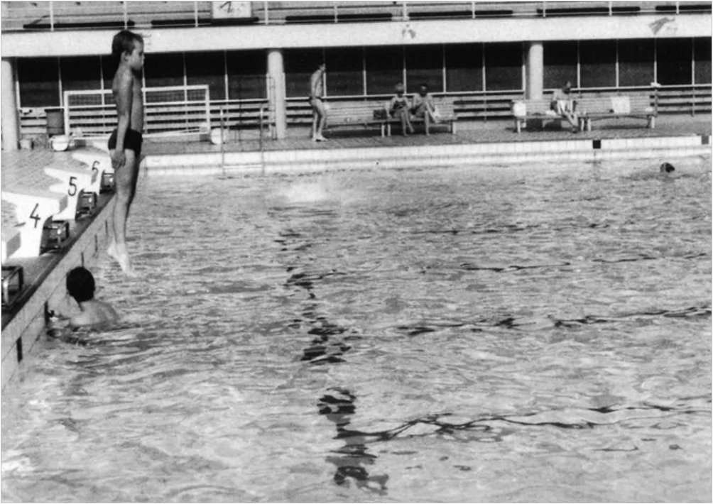 I řada učitelů a patriotů z našeho břehu Vltavy pod památným Vyšehradem se v Podolí naučila plavat a skákat z věže. Jako obrazovou ukázku z letité historie bych doložil svými fotografiemi, neboť i já jsem se zde naučil v pěti letech plavat. Fotky mě zachycují při vstupu do školy, při mém prvním skoku z věže a běžném skoku ve venkovní padesátce. A jak je vidět na dobovém snímku, zmíněná skulptura Vladimíra Janouška zde už tehdy opravdu stála. Ani dnes ji nelze z ulice ani tramvaje přehlédnout. S úspěchy našich plavců je pro mne dodnes jistým symbolem a nostalgickou vzpomínkou na minulost, ale i žhavou současnost našeho Podolí.