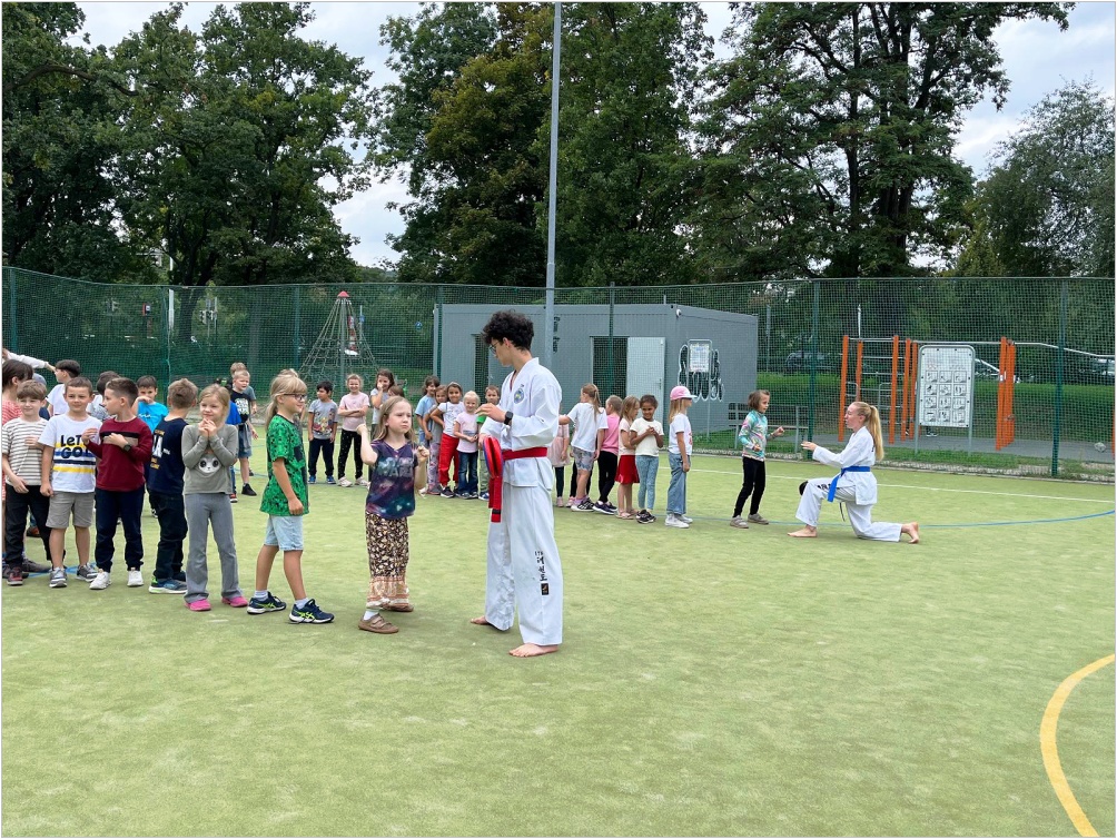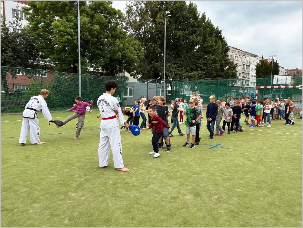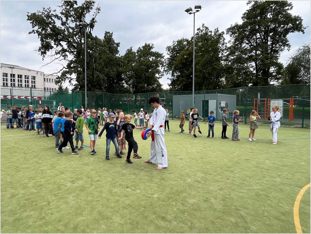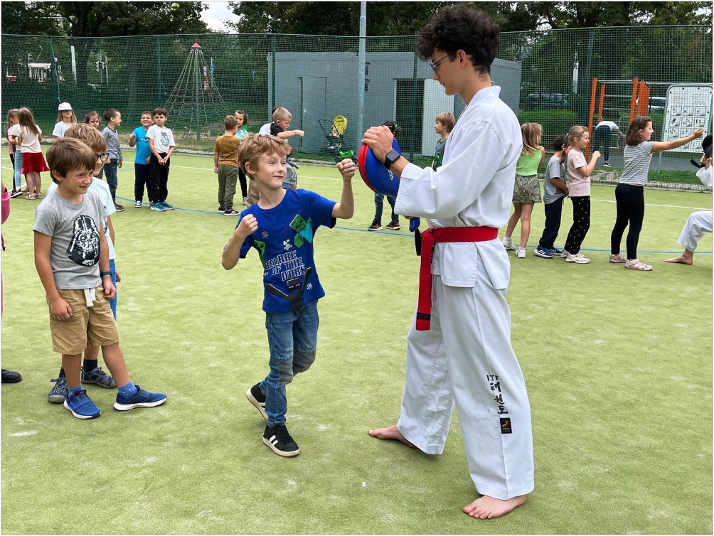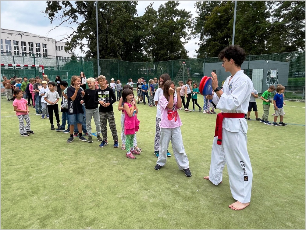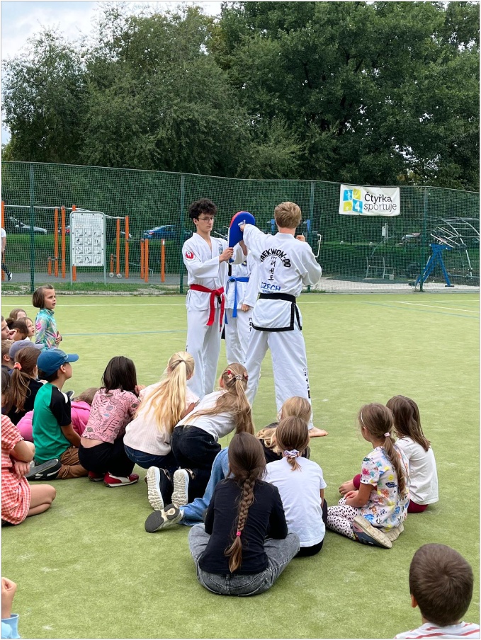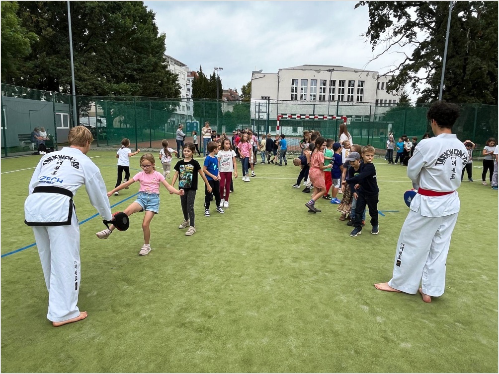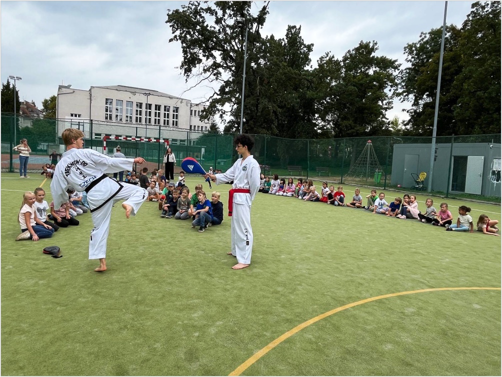 Ve středu 10. září proběhla na hřišti ukázková hodina olympijského korejského umění sebeobrany Taekwon-da, sportu, který na naší škole již několik let funguje jako kroužek. Lektoři předvedli ukázky bojových sestav, obranných úderů a kopů. Poté si rozdělili děti do skupin s praktickou výukou.